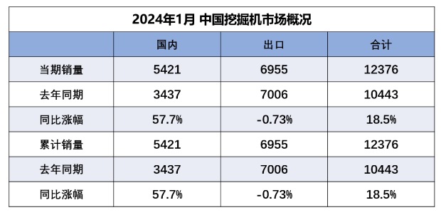 2024年1月份挖掘机、装载机销量分析:国内大幅增长,出口小幅回落